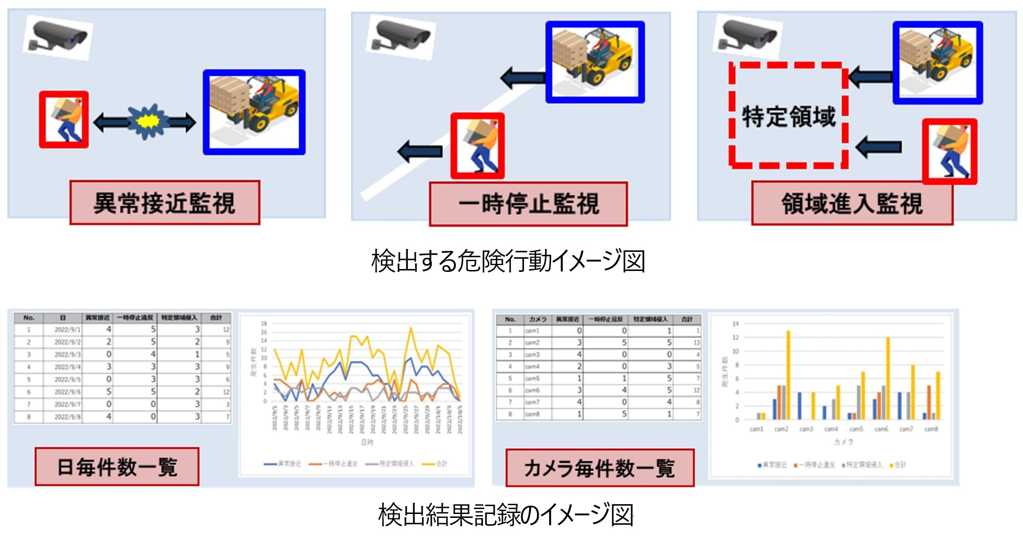 「リアルタイム解析ソリューションパッケージ」は、フォークリフトと人との異常接近や一時停止違反、特定領域進入の危険行動をリアルタイムに検知し警告をすることで施設内の事故を予防し、検知シーンの動画や検知結果の統計の活用によって危険行動の分析や従業員への安全意識醸成の実現が可能となります。