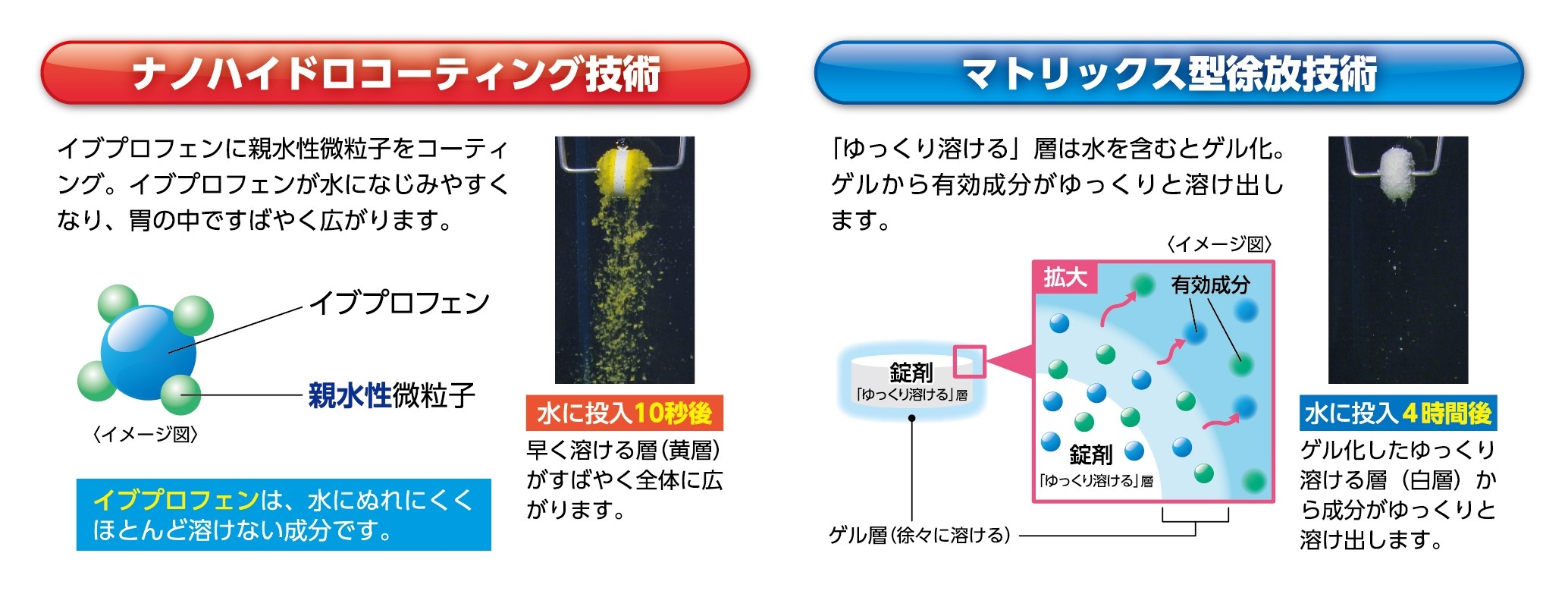 今回、OTC医薬品の総合感冒薬としては初めて、解熱鎮痛成分であるイブプロフェンと去たん成分であるアンブロキソール塩酸塩の2つの成分を同時に持続化することに成功しました。1つの錠剤内にナノハイドロコーティング技術を用いた「早く溶ける」層と、マトリックス型徐放技術を用いた「ゆっくり溶ける」層を組み合わせた時間差アクション錠で、1日2回の服用で効果がしっかりと持続します。また、錠剤を直径8.5mmの小粒錠とすることで、飲みやすさにもこだわっています。