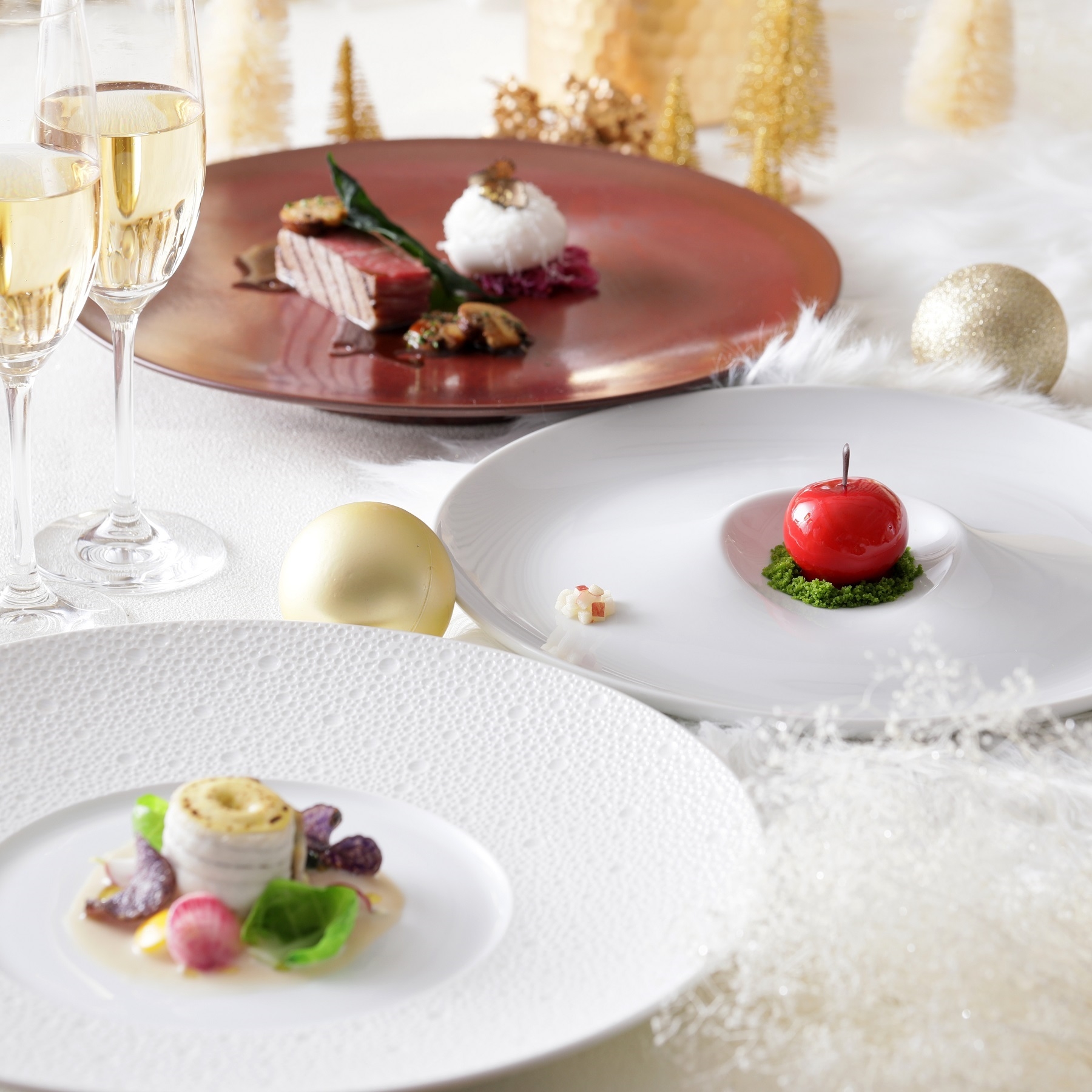 物語のキーとなる林檎をイメージしたファーストディッシュに口どけのよいフォアグラムースの塩味とフランボワーズナパージュ、七人の小人に見立て様々な調理法でお召し上がりいただける7種の野菜を付け合わせにした舌平目と生ハムのポーピエットなどをご用意。またデザートには白雪姫と王子様の真実の愛を表現し、赤色で統一たし苺のタルトジュレ、プチシュー、りんごモチーフの苺ムース、ラズベリーのシャーベットで爽やかな酸味とほのかな甘みに仕上げた見た目も愛らしい一品を。目でも舌でも楽しめるクリスマスシーズンにぴったりのコースメニューをお楽しみいただけます。