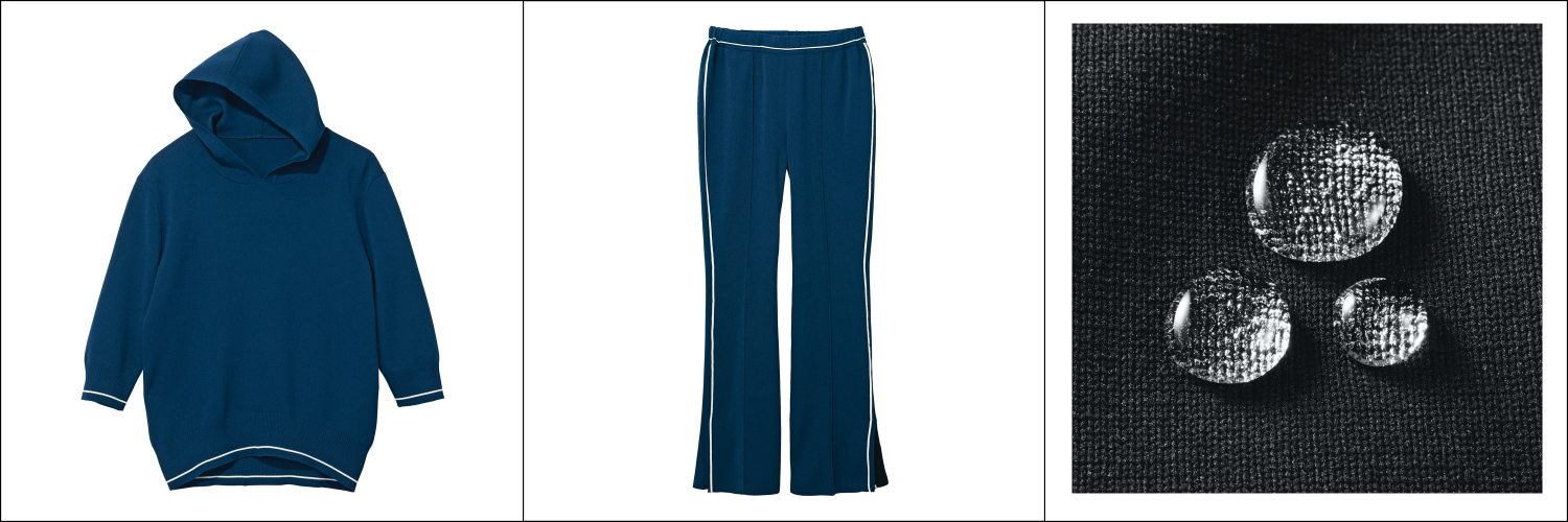 雨の日もアクティブに過ごせるヘルシー美人のためのニットセットアップもご用意しました。さらっと気持ちのいいニット素材にはっ水機能を加えたこちらのアイテムは、身体のラインを拾いにくい構築的なフォルムと軽さが特徴です。かぶり型のパーカーには立体的なフード、7分袖、ドロップショルダーの軽快なデザインが施され、リブ編みの配色ラインが爽やかな印象を添えます。パンツは脚長に見えるセンタータック。高さのある靴にも合うよう、裾にベント(切れ込み)を設けています。さらに、美脚効果を高めるサイドラインも特徴となっております。