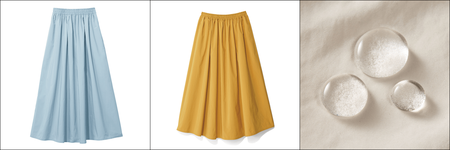 ミモレ丈のスカートもご用意しました。東レ株式会社のアーティローザ(R)を使用し、はっ水加工を施しました。微光沢を湛えたパウダリーな質感とオールシーズン楽しめる使い勝手のよさが魅力です。