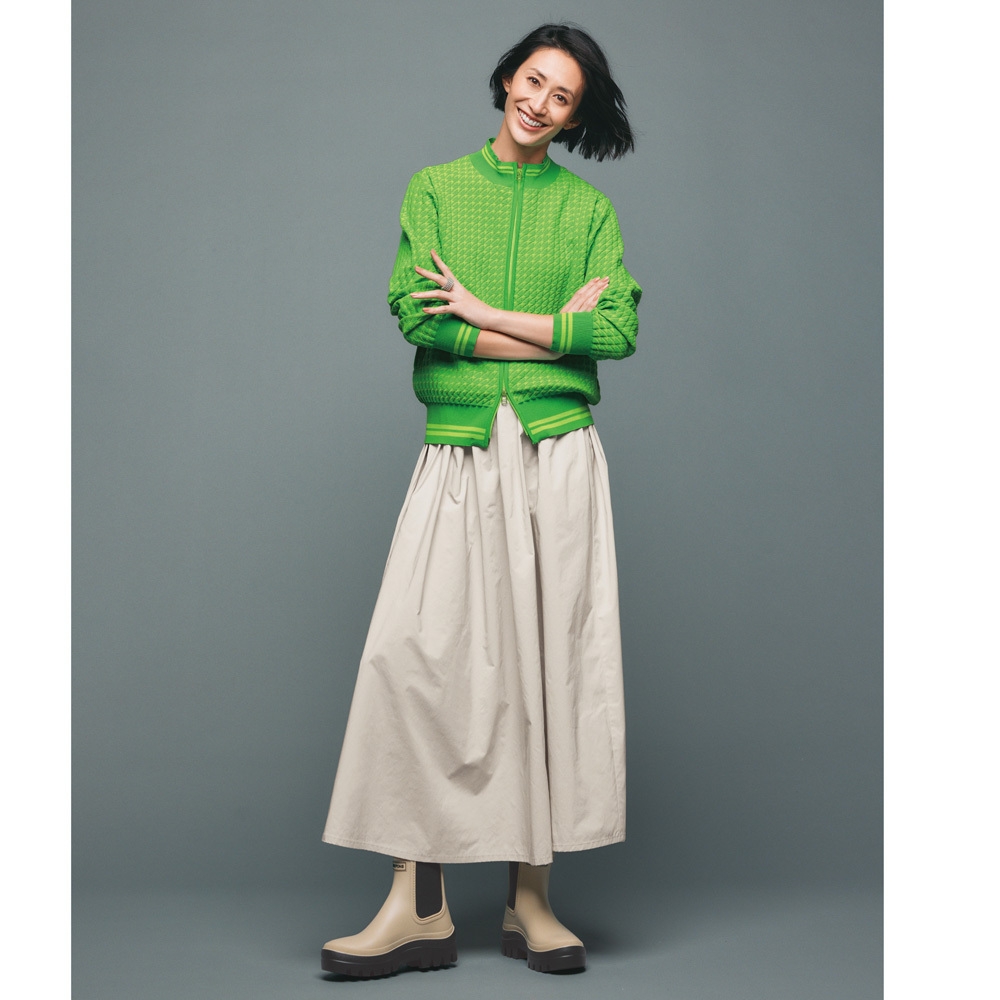 梅雨こそ、色のパワーでポジティブに!ドライタッチのはっ水糸で編んだコンパクトなジップブルゾン。凹凸のあるジャカード編みが繊細な影を生み、鮮やかなライムカラーに品のいい深みを与えます。両開きファスナーが程よい抜け感を作るのも、洗練された印象を与えます。