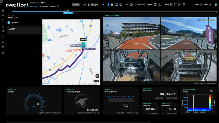 自動運転を実用化するためには、車室内の乗客や車両周辺の状況を遠隔地からモニタリングすることが求められます。everfleet(エバーフリート)ではモビリティの位置情報や車内外のカメラ映像に加え、車速・ステアリング・バッテリー残量などの車両データを統合して一元的に可視化し、信号機などの交通インフラと協調した外部データとの連携も可能です。これにより、運行状況を遠隔地からリアルタイムに把握し、安全・安心に自動運転モビリティを運用することができるようになります。さらに、複数地域の多種多様なモビリティを同時に群管理することや運行時の異常をシステムによって自動的に検出・通知することができるため、1人の遠隔オペレータによって、効率よく自動運転モビリティを運行管理することで、オペレーションの省人化を実現し、交通採算性の改善にも貢献します。