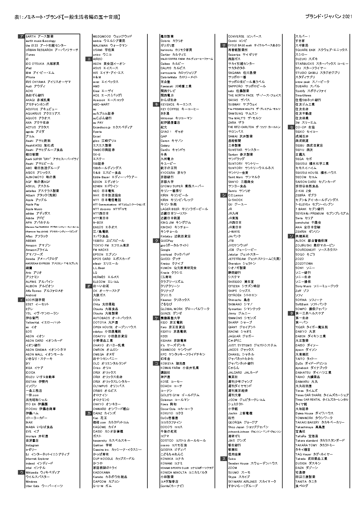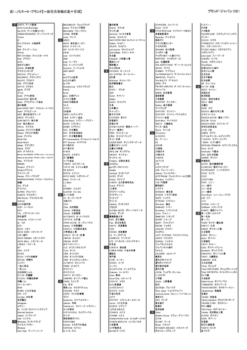 株式会社日経BPコンサルティング(東京都港区)は、2021年3月26日に発行を予定する「ブランド・ジャパン2021」で調査対象となる1,500のノミネートブランド(一般生活者編1,000ブランド、ビジネス・パーソン編500ブランド)を発表しました(表1~3)。