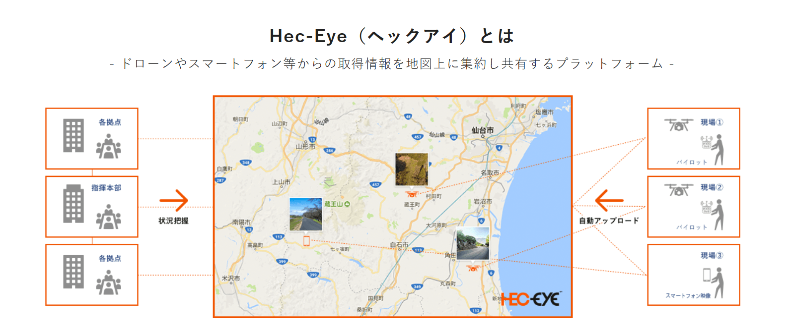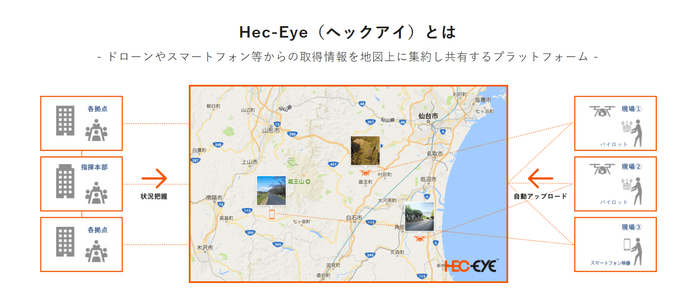 救急医療・災害対応分野での活動支援や業務効率化を目的として開発された「HecーEye」は、災害時に対策本部と現場が「Hec-Eye」という共通画面で繋がることで、飛行中のドローンが撮影している映像をリアルタイム配信できます。位置情報や移動経路、どのデバイスを使っているのかも含め、遠隔地からも一目で確認できます。それにより、迅速かつ正確な情報収集が可能であり、全ての情報が保存されるため、災害の復興時にも役立ちます。