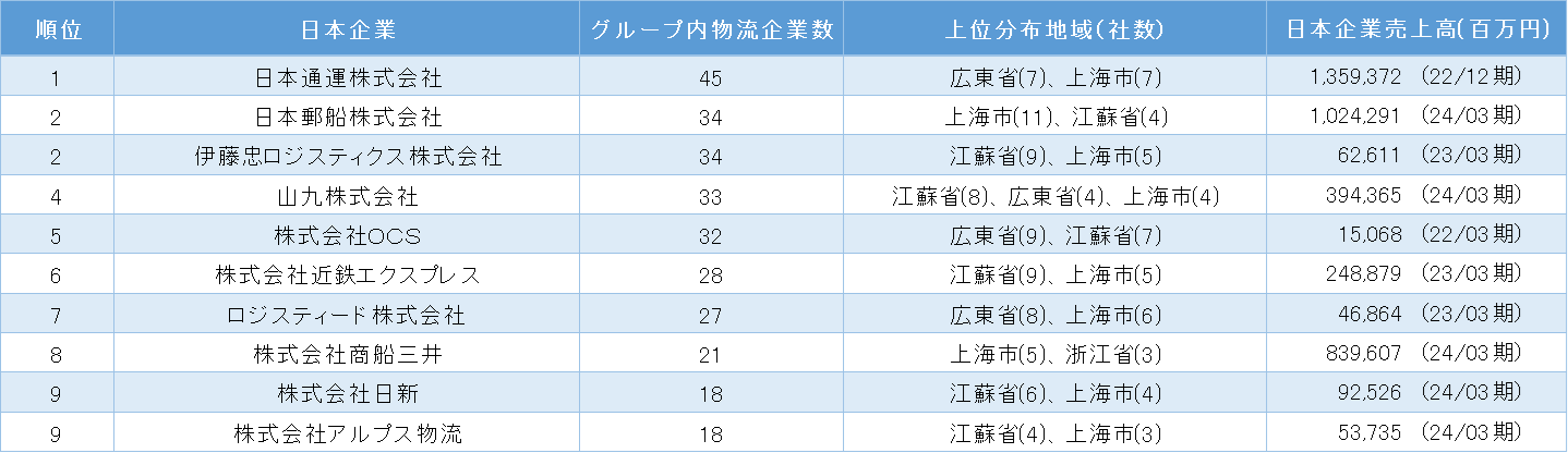 日系の物流業に対して、日本の親会社と紐付けた企業数をもとにランキングを作成したところ、1位「日本通運」(45社)、同順2位「日本郵船」「伊藤忠ロジスティクス」(34社)、4位「山九」(33社)という結果になりました。(表1)