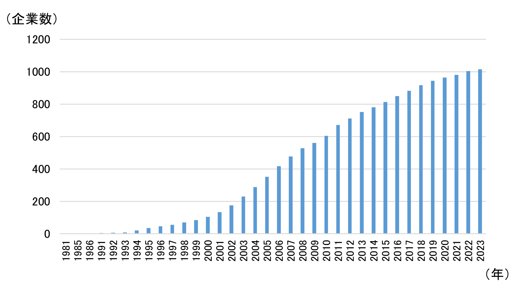 また、企業数の推移・地域分布に注目すると、中国の日系物流業は、1981年から中国に進出して以来、企業数は増加の一途をたどり、特に2000年以降に急激な増加を見せています。しかし、近年では増加傾向を維持しつつも、2011年からは成長率がやや鈍化しています。(図2)