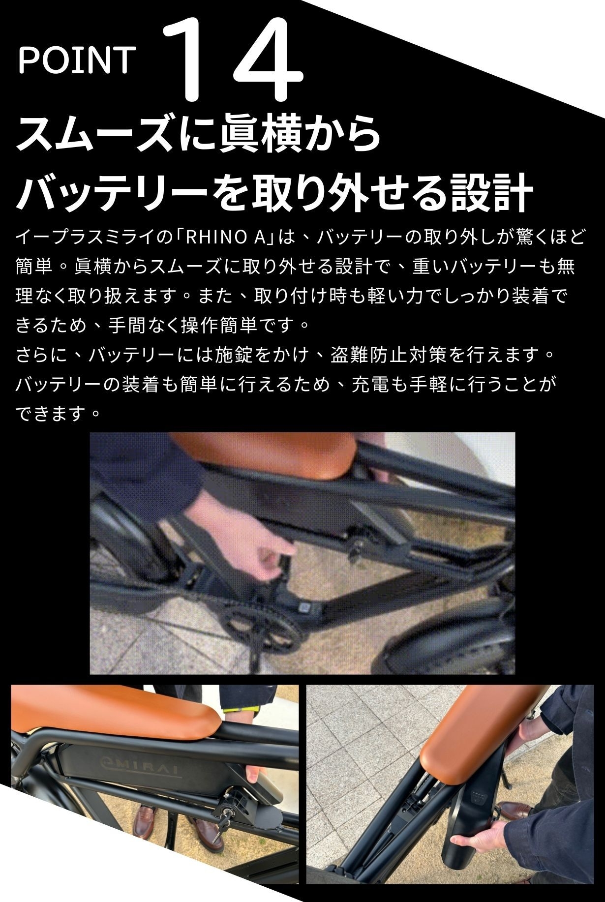 イープラスミライの「RHINO A/B」は、バッテリーの取り外しが驚くほど簡単。真横からスムーズに取り外せる設計で、重いバッテリーも無理なく取り扱えます。また、取り付け時も軽い力でしっかり装着できるため、手間なく操作簡単です。さらに、バッテリーには施錠をかけ、盗難防止対策を行えます。バッテリーの装着も簡単に行えるため、充電も手軽に行うことができます。