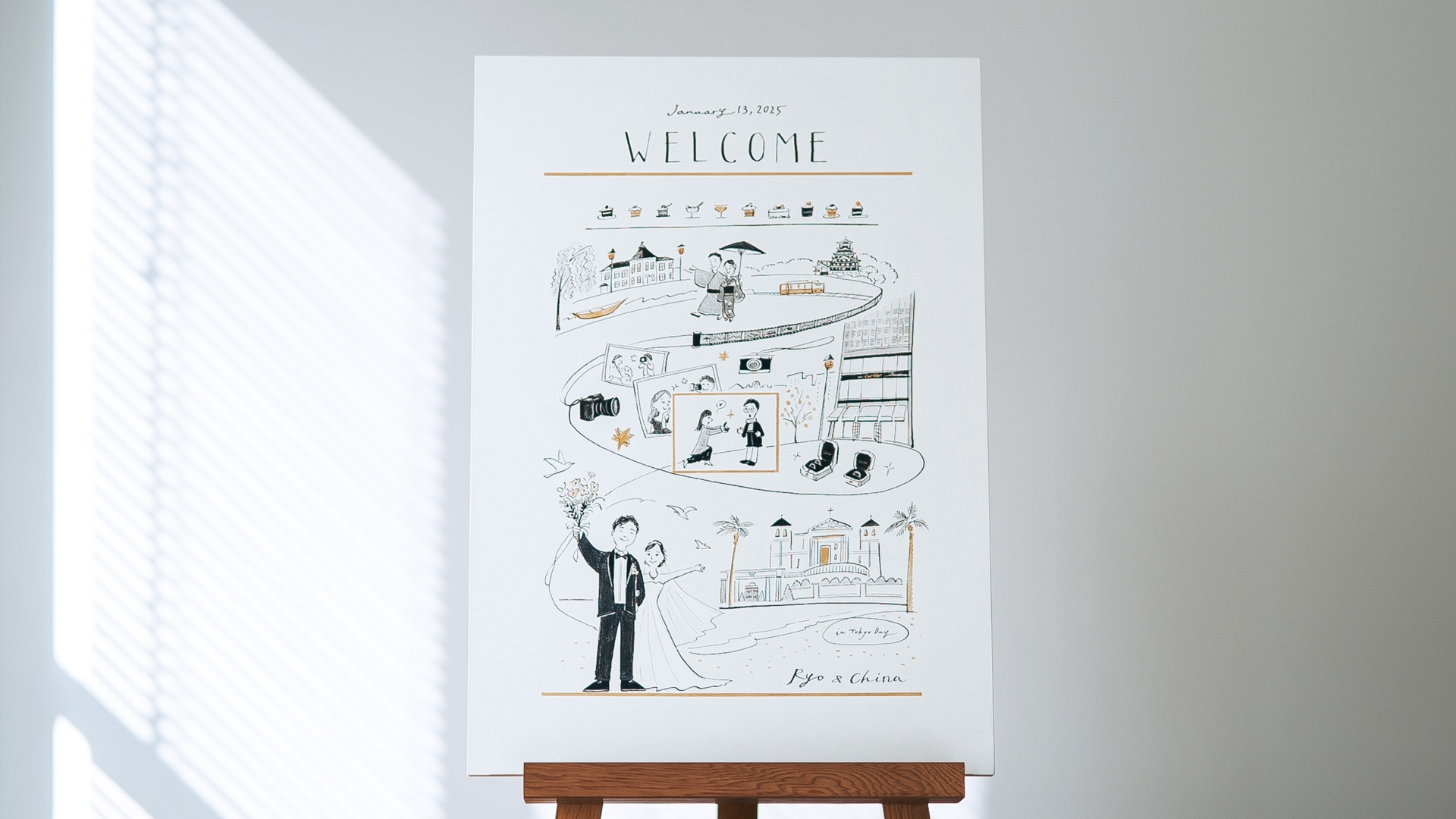 WORLD1でウェルカムボード「episode art」をご購入のお客様は、イントロやおふたりパートにそのイラストを使用可能。思い出や似顔絵と調和した、よりパーソナルなムービーが実現します。