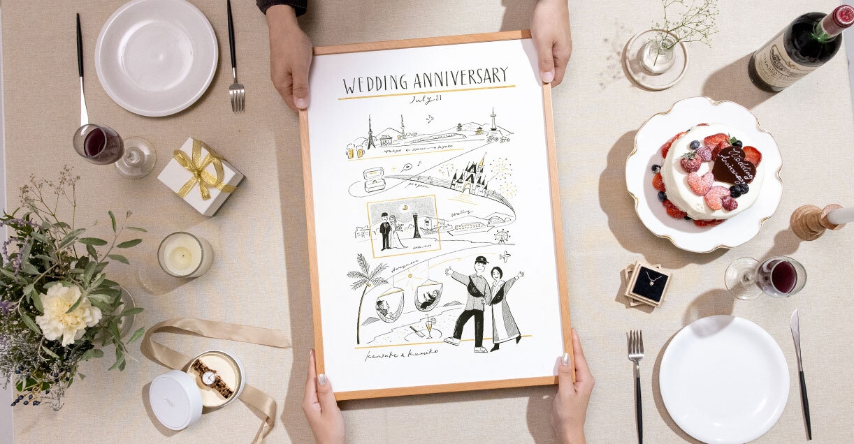 人気イラスト作家・ancoさんが1枚ずつ丁寧に手描きした温かみのあるイラストを使用し、おふたりそれぞれのエピソードを彩ります。