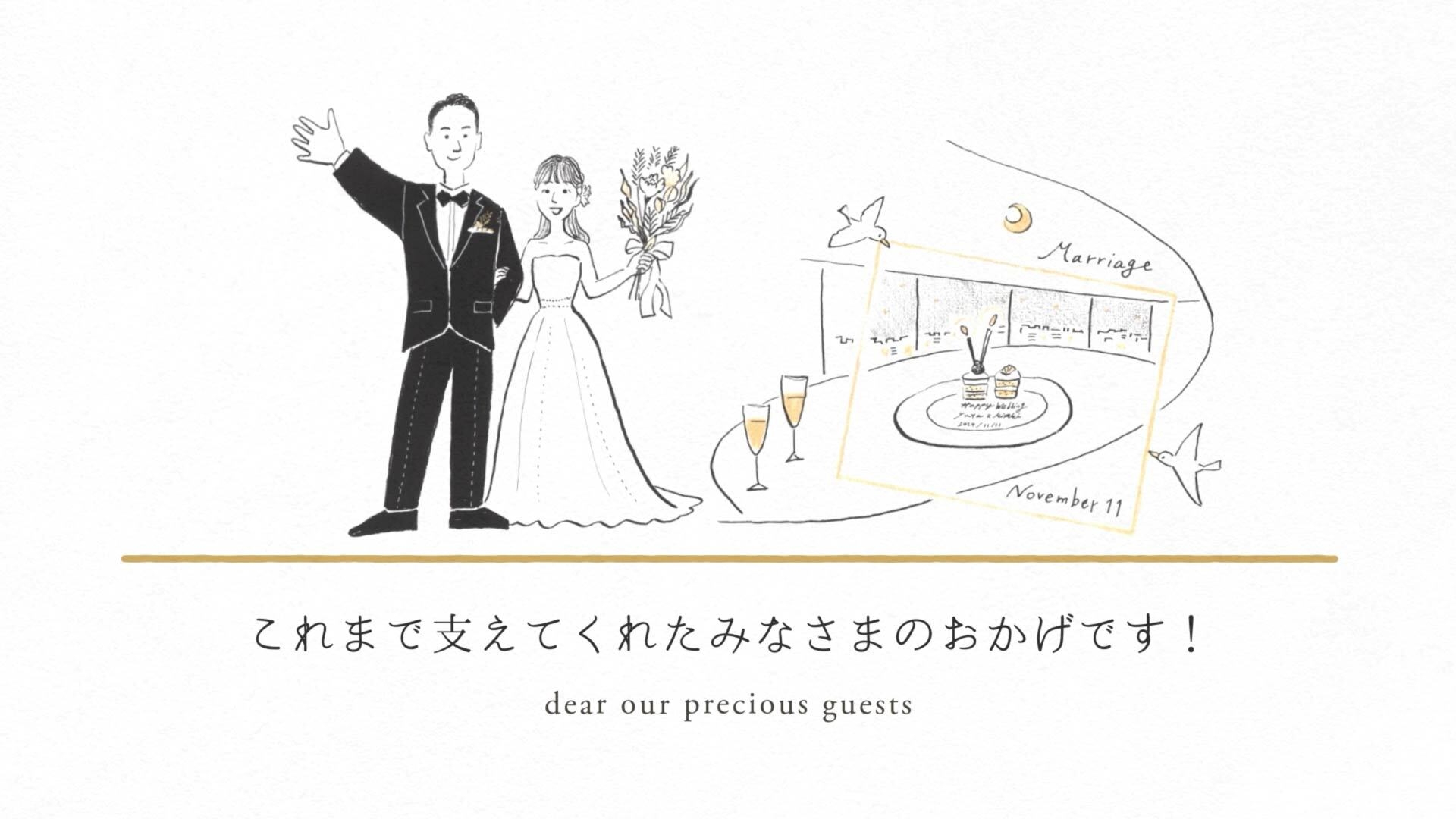 パラパラ漫画のようなカクカクとしたアニメーションにより、明るく楽しい雰囲気を演出。新郎・新婦パートでは12種類、おふたりパートでは19種類のイラストから選べる自由度の高い構成です。