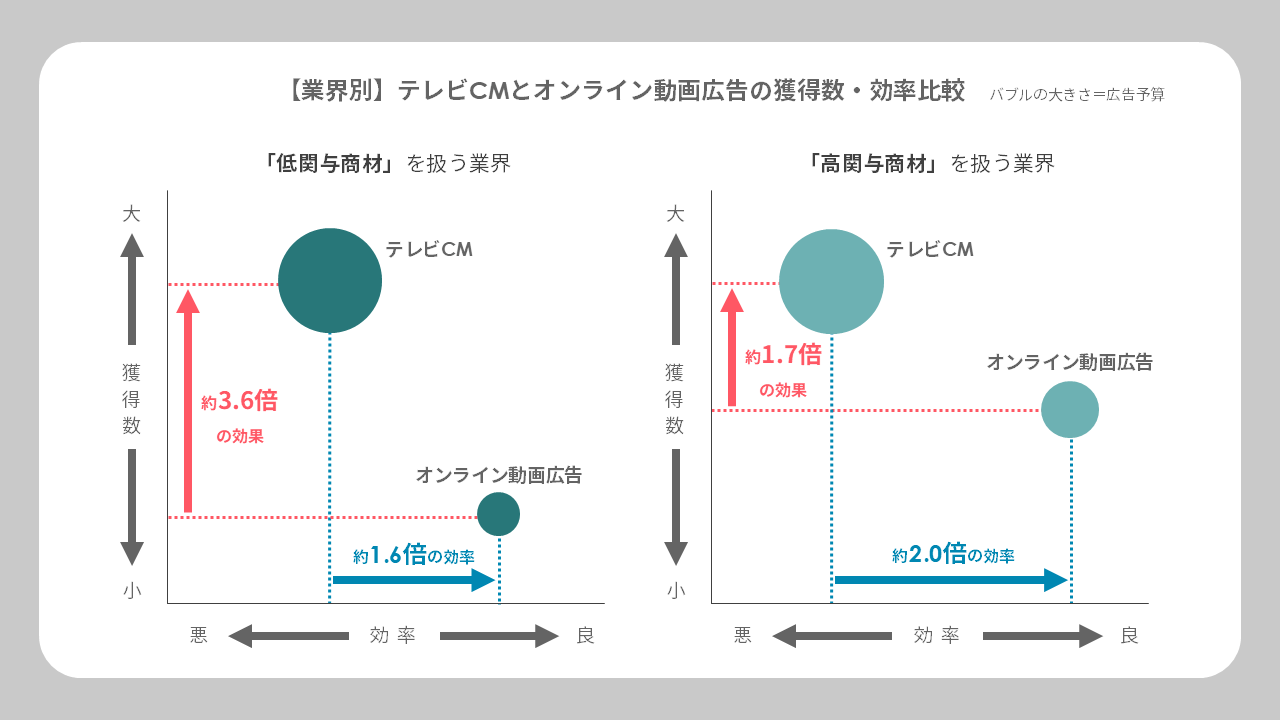 - 「低関与商材」を扱う業界は、特にテレビCMの獲得数が大きく(オンライン動画広告の約3.6倍)、「高関与商材」を扱う業界は、オンライン動画広告の効率が良好(テレビCMの約2.0倍)