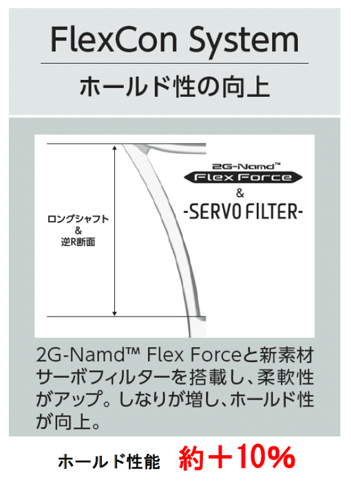 シャフト部には、振動減衰性と柔軟性に優れる新素材「サーボフィルター」を採用。インパクト時の雑振動をカットし正確な打球感覚を伝えます。また、シャフト部に搭載した「フレックスコン システム」は新素材使用でしなりが増し、ホールド性が向上することで柔らかい打球感と球持ち感を実現しました。さらに、フレーム全体はカーボン量を増やし剛性を高める新設計で、面安定性が高まり打球軌道が安定化します。
