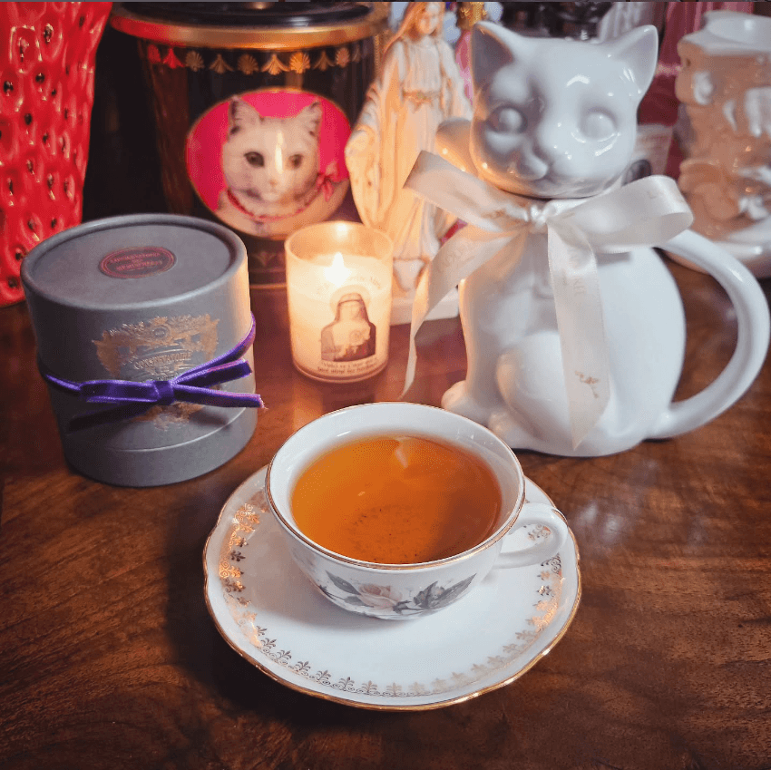 店内は、店主の愛猫をモチーフにしたロゴや、イギリス製陶器の猫のポットなど、猫にちなんだアイテムが多数並びます。