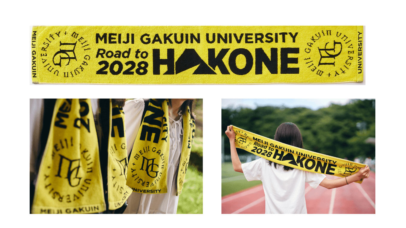 この度、プロジェクトをさらに盛り上げるためにオリジナルタオルを制作し、販売を開始しました。本学のコーポレート・カラーであるイエローをベースに、本学のロゴと“Road to HAKONE 2028”を大きく配置。視認性を高くし、応援者と選手が一致団結できるようなデザインに仕上げました。今年の箱根駅伝予選会では選手から「本学の幟をみると力が沸いてタイムが10秒速くなる気がする」というコメントがありました。そこで、応援グッズを活用して、箱根駅伝本戦の出場とそこでの活躍を後押ししていきます。