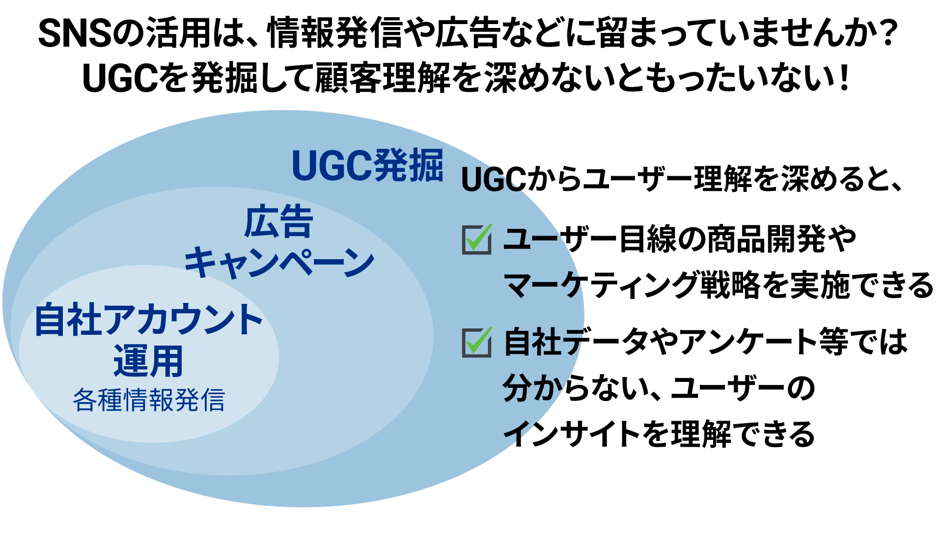 SNSの普及が進む中、企業からは、自社のSNSアカウントからの情報発信や広告・キャンペーンの展開だけでなく、さまざまなSNSにおいて日々発信される膨大なUGCから自社の商品・サービスに対するユーザーの願望や不満を探り、ユーザーの本音をマーケティング活動や商品開発へ積極的に活用したいという声も聞かれます。しかし、「SNS分析ツールを使っても、UGCをうまく収集できない」「データ分析のスキルが不足している」「X、Instagram、TikTok、YouTubeは投稿量が膨大で確認する時間がない」といったリソースやスキル面の課題により、取り組みが進まないケースも多く見られます。