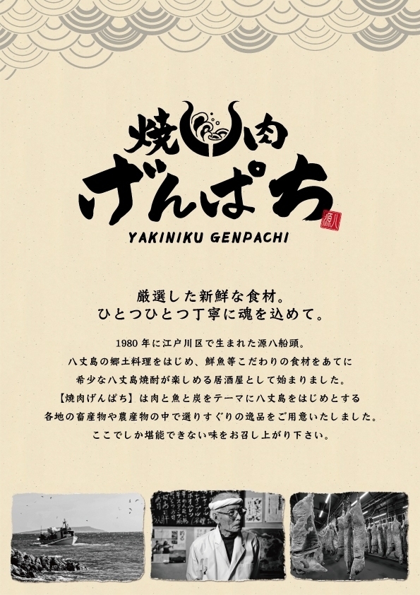 焼肉げんぱちでは、肉と魚と炭をテーマに八丈島をはじめとする各地の畜産物や農産物の中で選りすぐりの逸品を提供し、ここでしか堪能できない味をお楽しみいただけます。