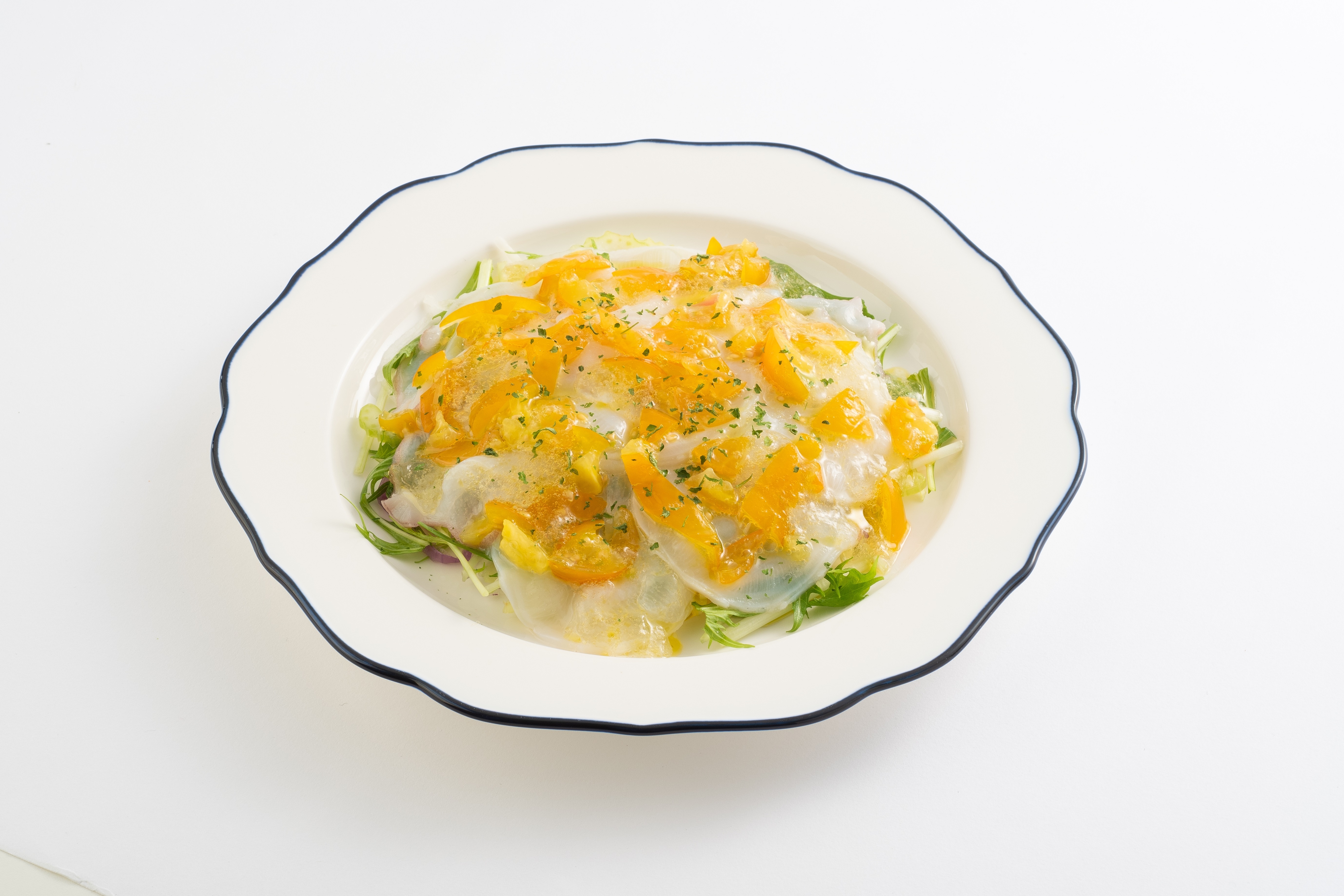 北海道産の柔らかい水ダコに、シャキシャキした食感の野菜とカラフルなトマト、甘酸っぱいビネガージュレを合わせました。