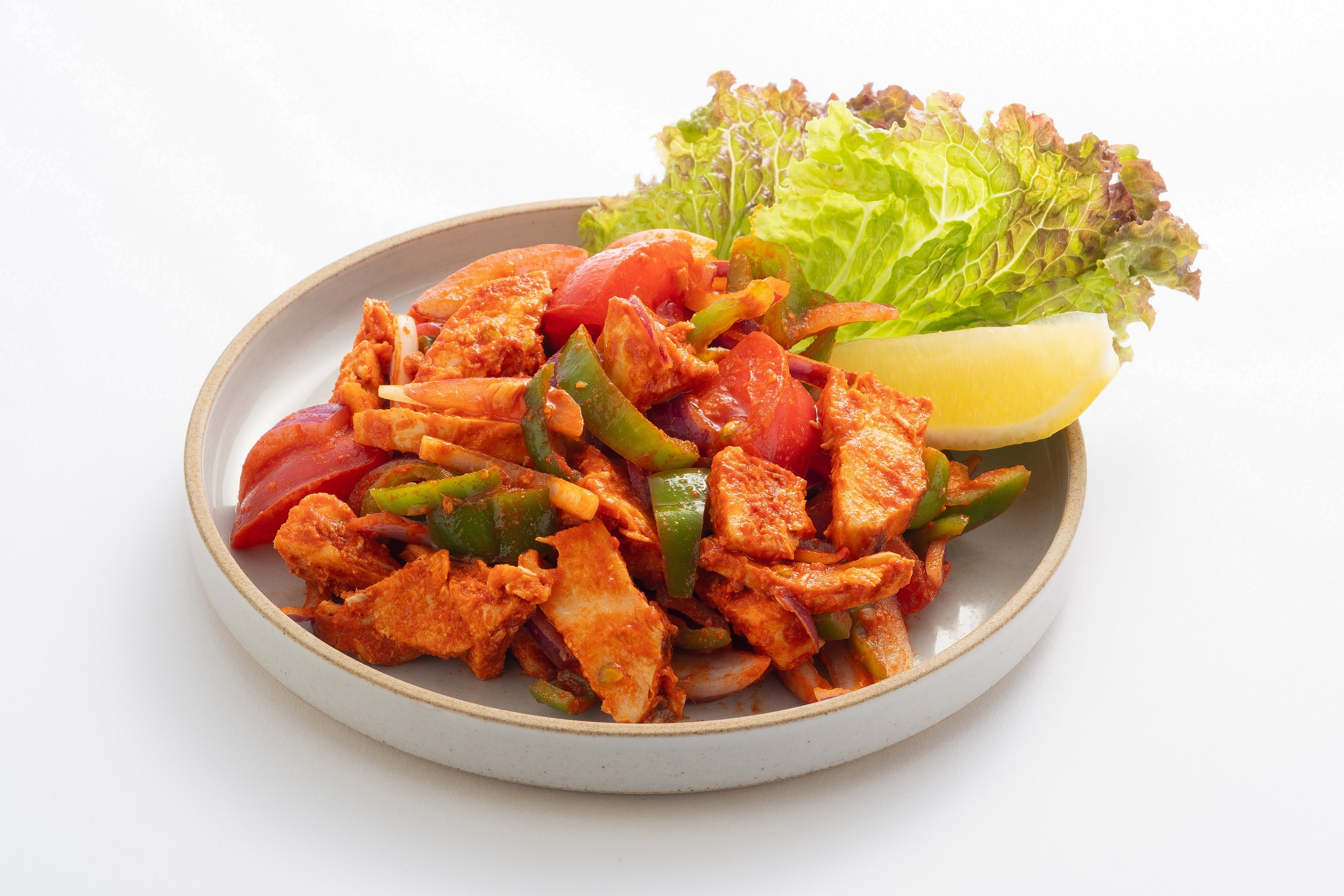 スパイスとヨーグルトのたれに漬け込んだ鶏肉を焼いた「チキンティッカン」と紫玉ねぎ、トマト、ピーマンの入った激辛サラダです。