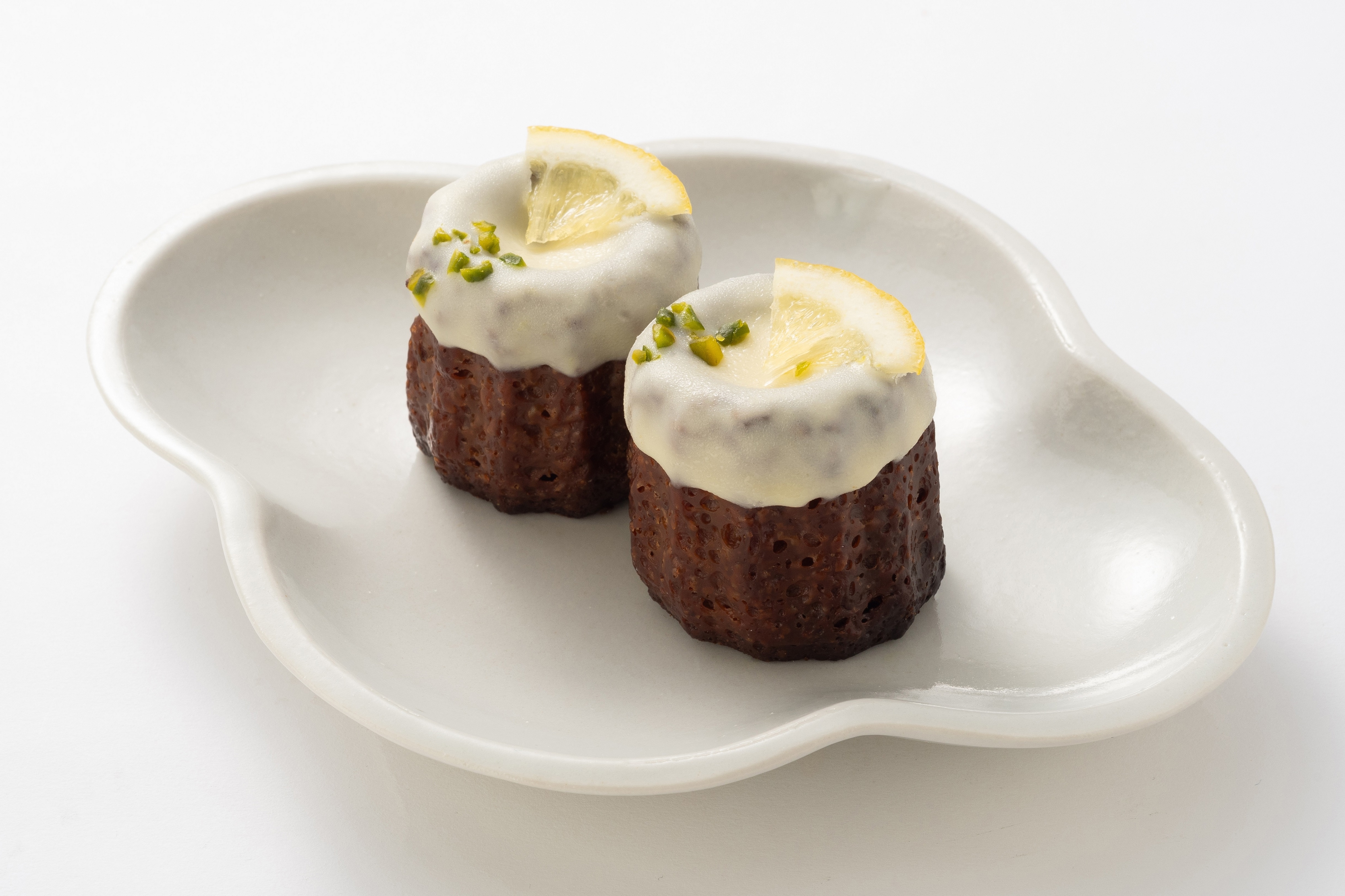 紅茶のカヌレにレモン皮入りのジュレとレモン風味のチョコレートをデコレーション。見た目にも爽やかなカヌレです。