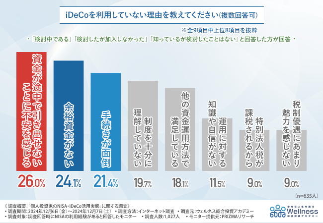 前の質問で『検討中である』『検討したが加入しなかった』『知っているが検討したことはない』と回答した方に、「iDeCoを利用していない理由を教えてください(複数回答可)」と質問したところ、『資金が途中で引き出せないことに不安を感じる(26.0%)』と回答した方が最も多く、『余裕資金がない(24.1%)』『手続きが面倒(21.4%)』と続きました。