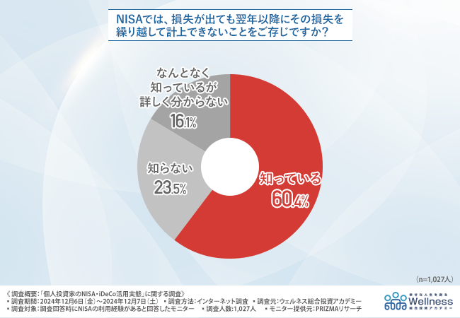 「NISAでは、損失が出ても翌年以降にその損失を繰り越して計上できないことをご存じですか?」と質問したところ、『知っている(60.4%)』と回答した方が最も多く、『知らない(23.5%)』『なんとなく知っているが詳しく分からない(16.1%)』と続きました。