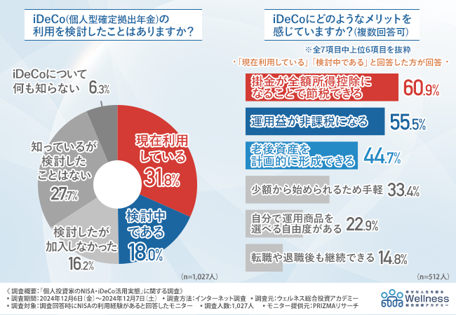 そこで今回、『ウェルネス総合投資アカデミー(旧 大阪FX教室)』(https://wellness-toushi.jp/)は、NISAの利用経験がある方を対象に「個人投資家のNISA・iDeCo活用実態」に関する調査を実施しました。
