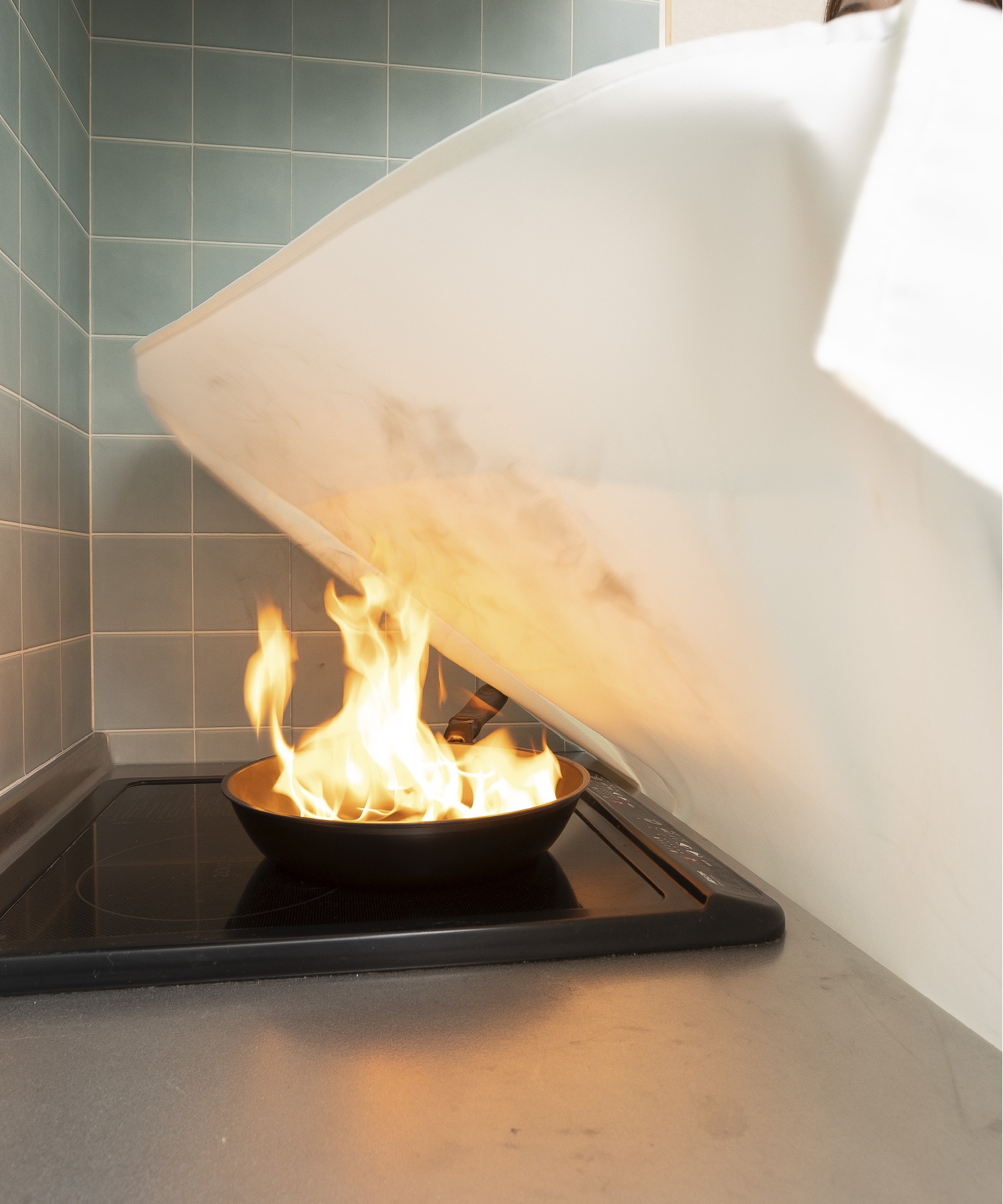 - 持ち手を持ったまま、ブランケットを火の上にかぶせます。その後コンロなどの熱源をすべてオフにします。これにより、火が消えるまでにかかる時間が短縮されます。※ブランケットより大きな火の場合はすぐに消防に連絡してください。