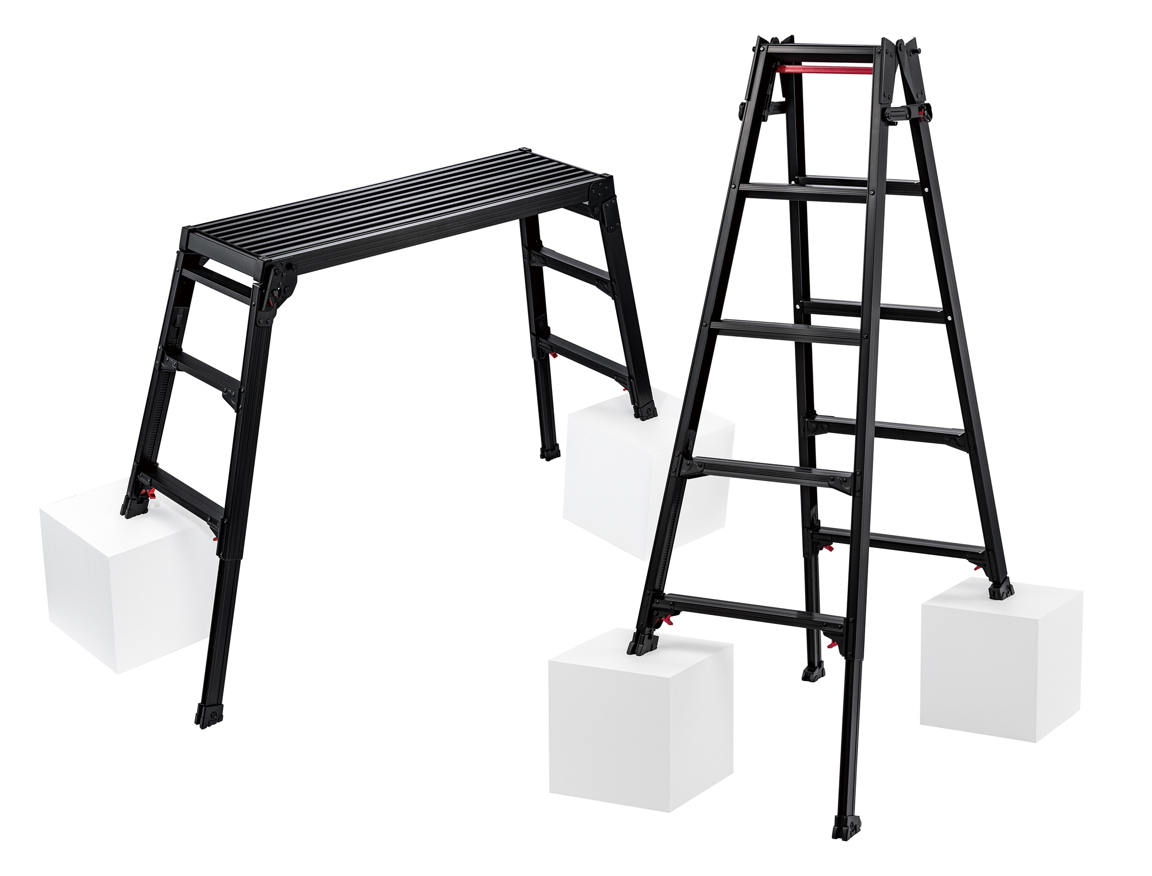 当シリーズのラインナップは自社製品でも特に人気の高い「はしご兼用脚立」や、「脚部伸縮脚立」「足場台」など全5機種、内4機種は新発売。
