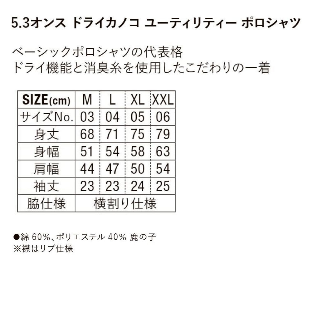 こちらのポロシャツは、鹿の子編みで仕上げたベーシックタイプのポロシャツに、吸水速乾・消臭機能・UVカットといった機能が備わったアイテムとなっております。
