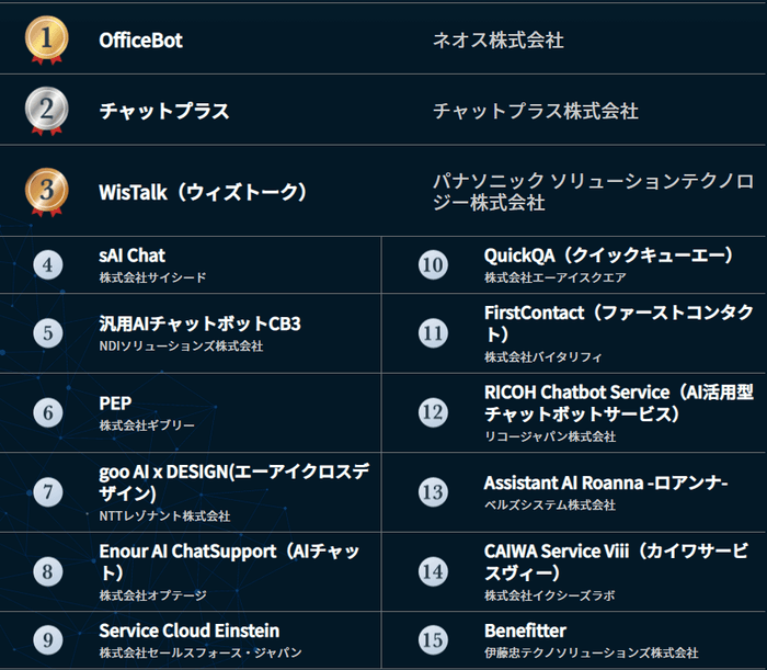 ネオス株式会社の提供する「OfficeBot」が1位となりました!OfficeBotは社内問合せ対応の効率化やナレッジマネジメントに簡単に活用できるAIチャットボットです。FAQがなくても社内文書を登録するだけで、AIが文書内を分析、自動学習し、最適な回答ができるチャットボットが出来上がります。