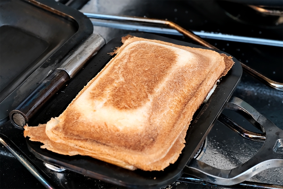 また、鉄の重さにより密閉される構造のため、パン内部の水分や香りを逃さずに焼き上げることができます。このことにより、パンそのものの風味や香ばしが凝縮されておいしいホットサンドになります。