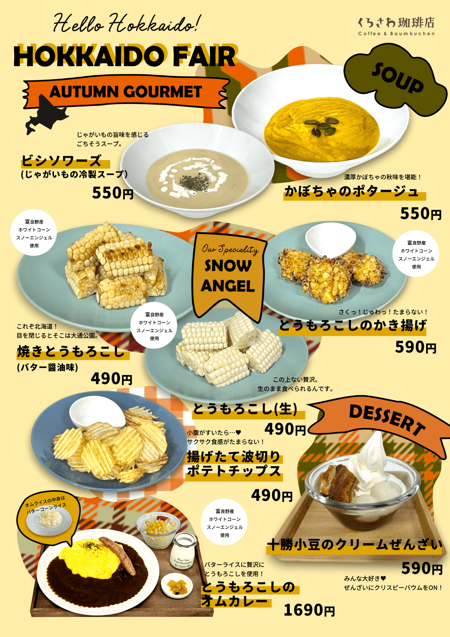現在くろさわ珈琲店では秋の北海道フェアを開催中です。富良野産のホワイトコーン「スノーエンジェル」を使用したとうもろこしメニューをご堪能ください。