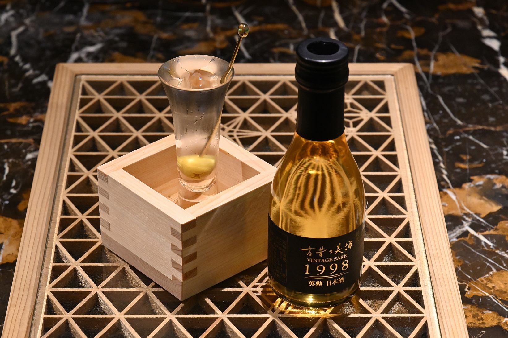 京都伏見の古酒「古昔の美酒 1998英勲」をベースに京都のクラフトジン「季の美」と京食文化には欠かせない出汁を使用した和風テイストのダーティーマティーニ。
