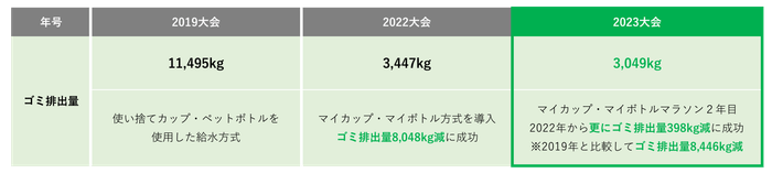 今大会は、昨年と比べ参加者が約4,000人増となったにも関わらずゴミ排出量は398kg減を実現しました。以前の運営方式(2019年大会)では給水において約50万個の使い捨て紙コップ・プラカップ、約31,500本のペットボトルを使用。大会で排出されていたゴミの総量は11,495kgでした。今年はゴミの総量が3,049kgとなり、以前の運営方式と比べると8,446kg減となりました。マイカップ・マイボトル方式をきっかけにゴミゼロの促進をはかった結果、参加ランナーのみならず、運営ボランティア、応援者・来場者すべての皆さんの環境配慮意識が向上していることが見てとれます。