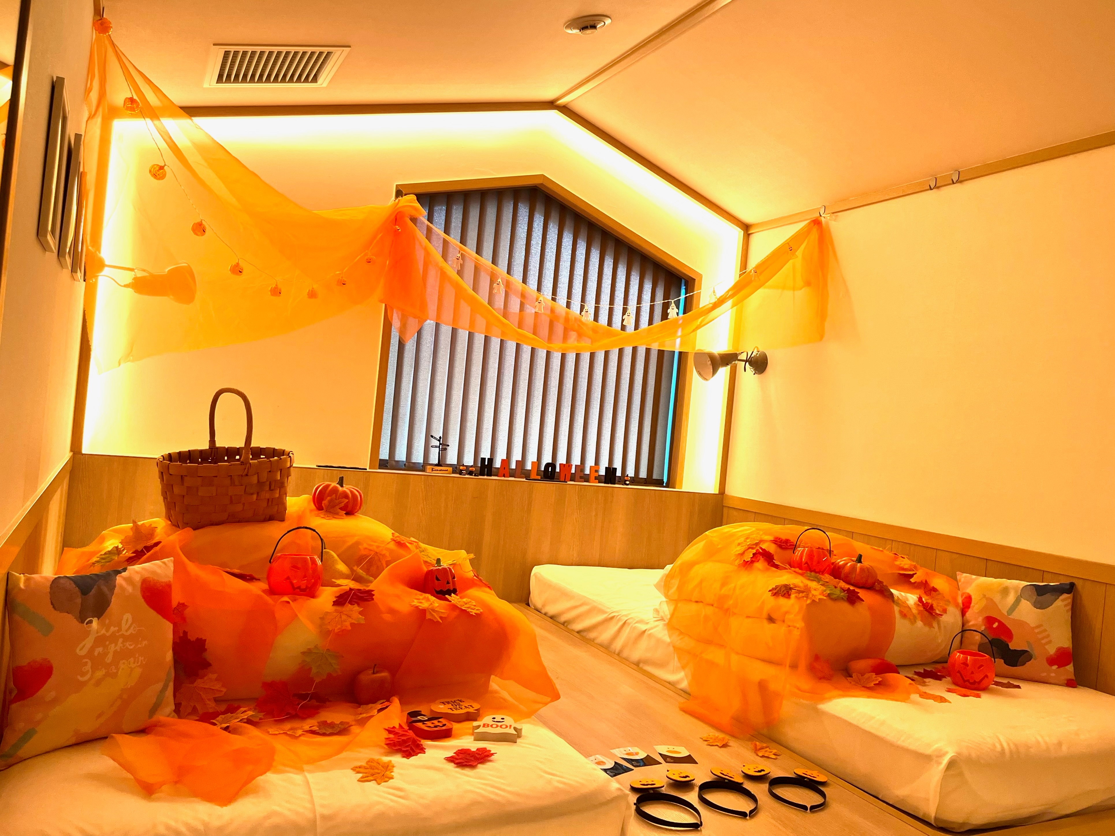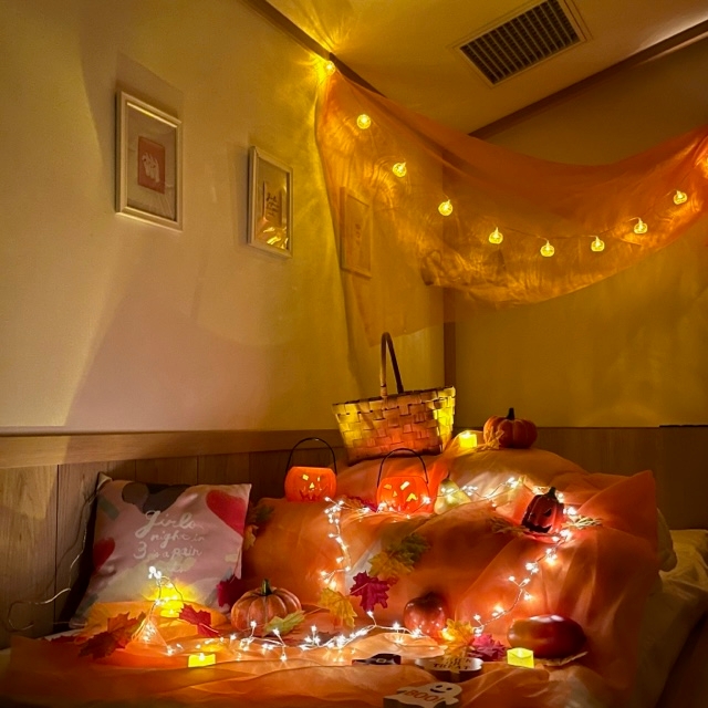 今年のお部屋はたくさんのかぼちゃがお客様をお出迎えする「かぼちゃルーム」。部屋に入ると、かぼちゃをイメージしたオレンジと黒の雰囲気に包まれて一気にハロウィン気分に。壁に貼られたオシャレなポストカードのインテリアで写真映えも間違いなし!部屋の電気を消してイルミネーションライトを点ければさらにハロウィンの夜の雰囲気を楽しめます♡