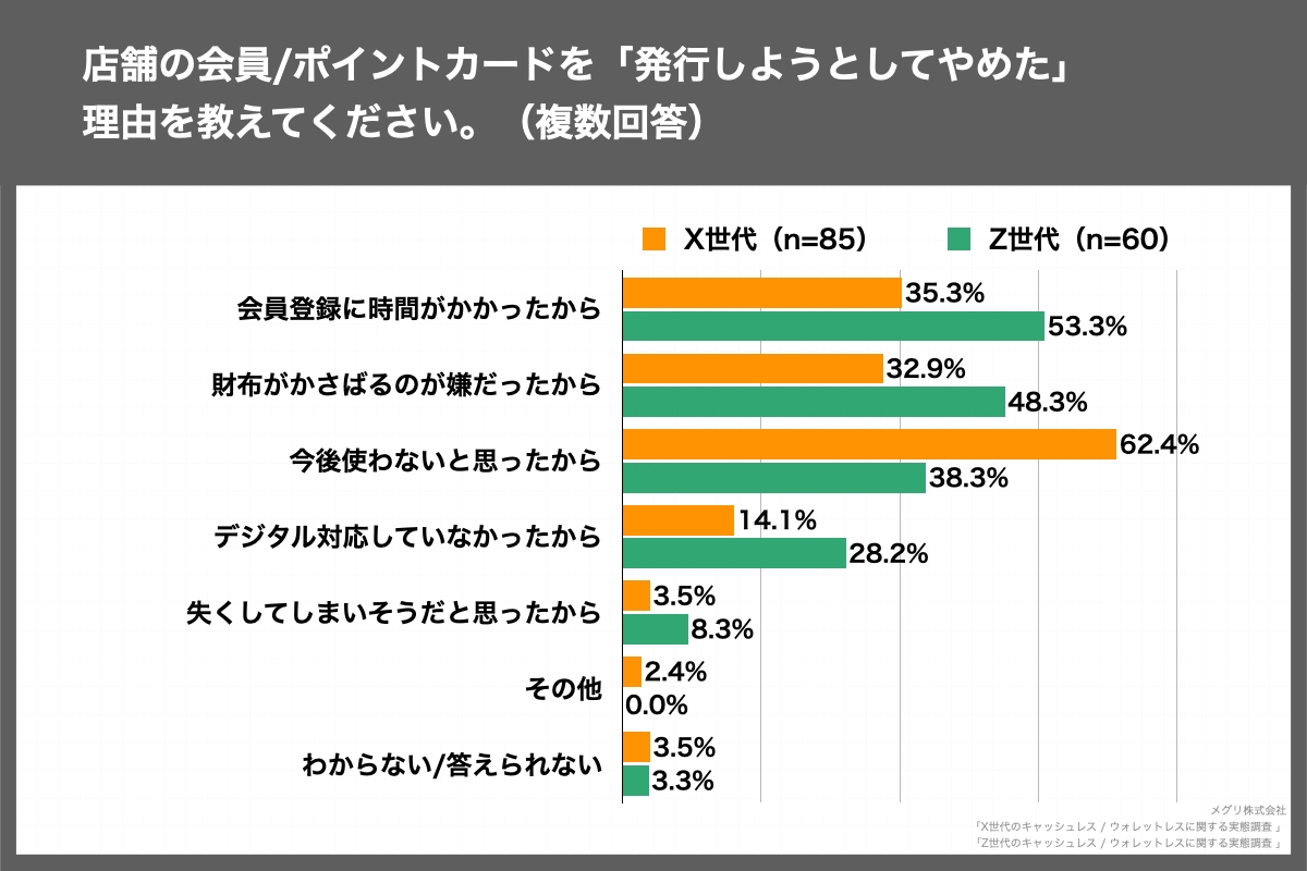 「店舗の会員/ポイントカードを「発行しようとしてやめた」という経験はありますか。」という質問に「何度もある」「数回程度ある」と回答したX世代に、「店舗の会員/ポイントカードを「発行しようとしてやめた」理由を教えてください。(複数回答)」(n=85)と質問したところ、「今後使わないと思ったから」が62.4%で最多、次いで「会員登録に時間がかかったから」が35.3%という結果に。Z世代の理由は「会員登録に時間がかかったから」(53.3%)が最多、次いで「財布がかさばるのが嫌だったから」(48.3%)という結果となった。