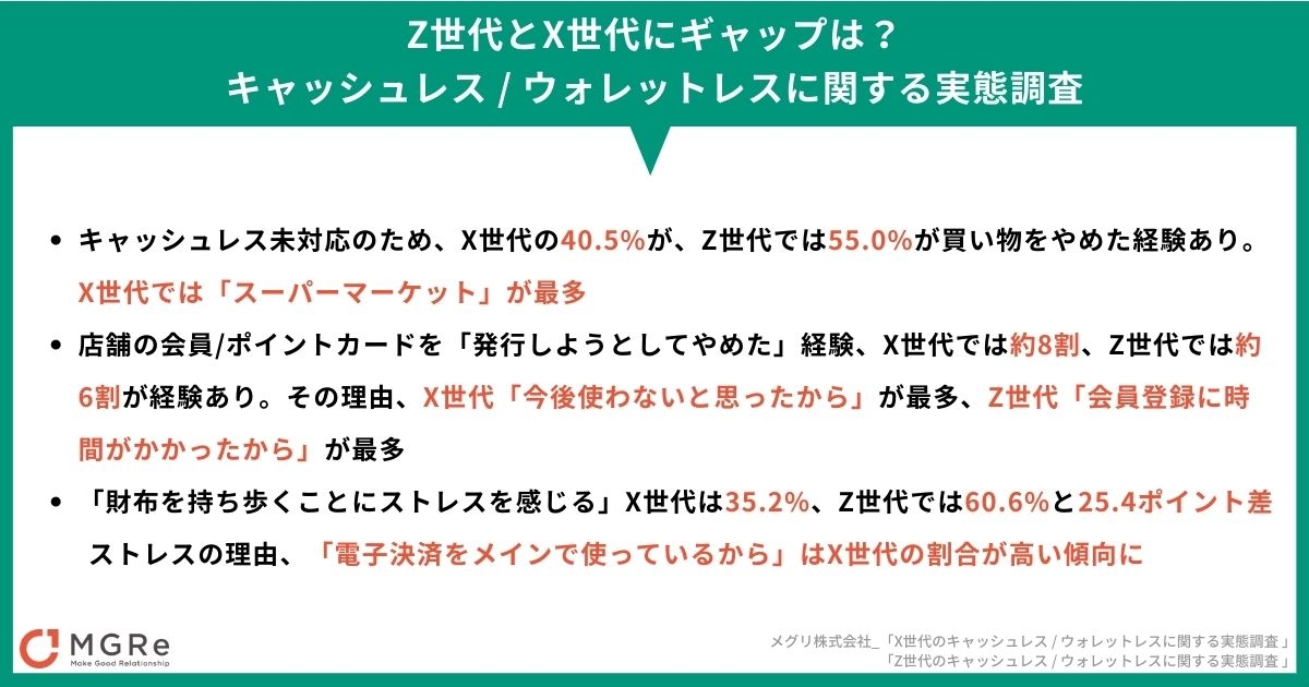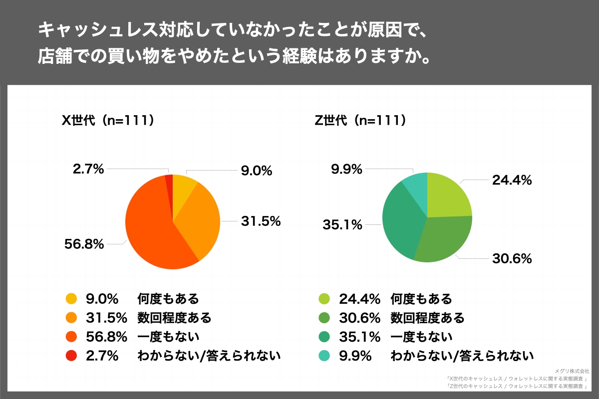 ・キャッシュレス未対応のため、X世代の40.5%が、Z世代では55.0%が買い物をやめた経験あり。X世代では「スーパーマーケット」が最多