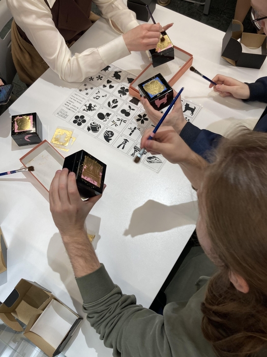 また、金沢城公園では金沢城址の特長などを見学しました。次に、石川県観光物産館を訪れ、参加者は金箔貼り体験をしました。