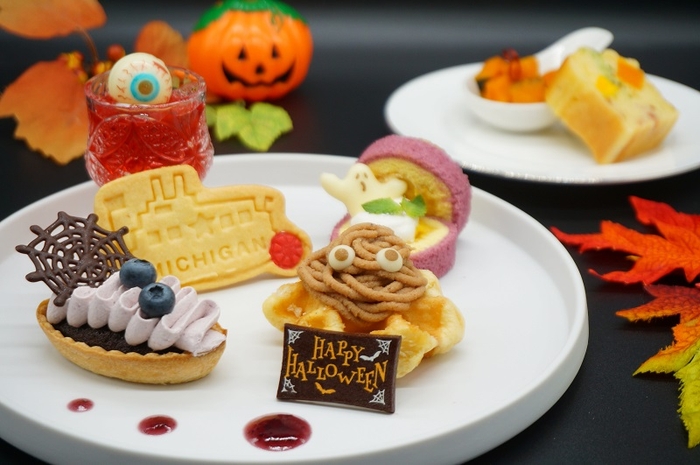 ・おばけが飛び出るさつまいもロール ・目玉ゼリー(ストロベリー) ・モンスターワッフル(モンブラン)