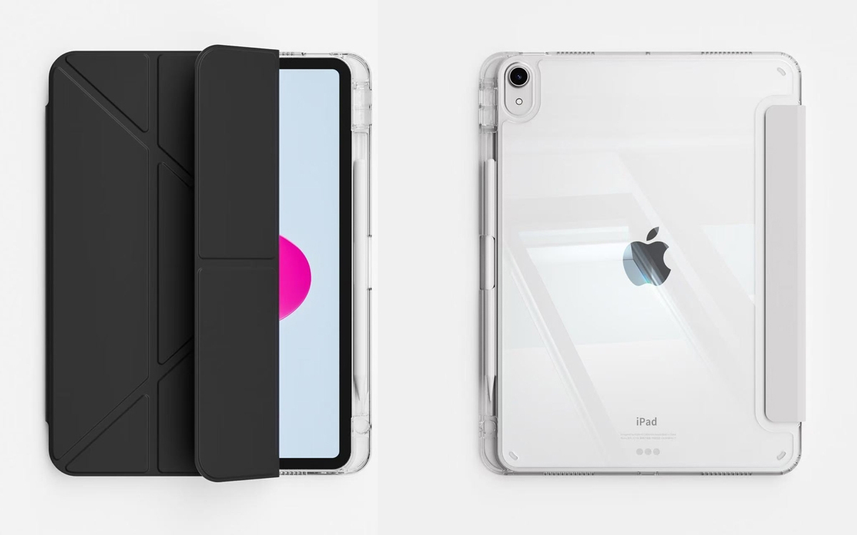ユニークなY字フォールドデザインのフロントカバーを備えたクリアバックケース。