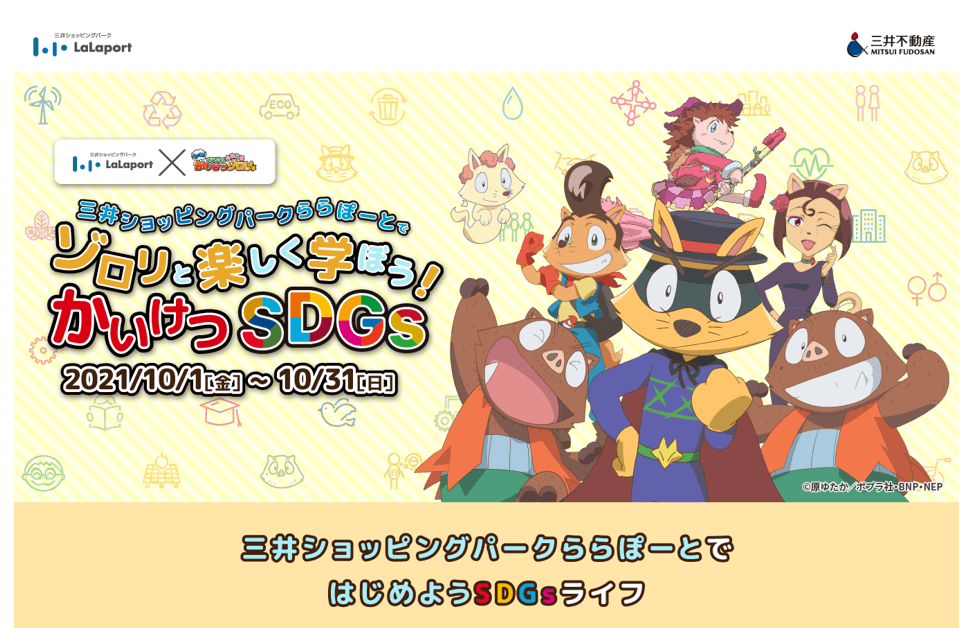 本企画は、三井ショッピングパーク ららぽーとのSDGsへの取り組みの一環として実現しました。人気キャラクター「かいけつゾロリ」と一緒にSDGsについて学べるコンテンツや、ワークショップ、ライブコマースなど、様々な企画をご用意しております。