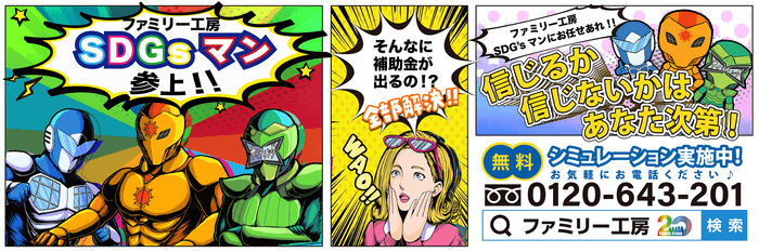株式会社ファミリー工房(本社:東京都足立区、代表取締役:古藤 晃英)は、住宅リフォームの魅力と各種補助金制度を楽しく・わかりやすくお伝えするため、アメコミ風ヒーロー「SDG'sマン」が活躍する新広告ビジュアルを制作しました。展開中の看板・動画広告は2025年11月末まで公開予定です。