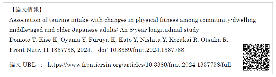 大正製薬株式会社[本社:東京都豊島区 社長:上原 茂](以下、当社)は、国立研究開発法人国立長寿医療研究センター(以下、長寿医療研究センター)と北翔大学との共同研究で、食事からのタウリン摂取量が多いと8年後の脚の筋力(膝伸展筋力)が維持される傾向にあることを見出し、食品科学と栄養学に関する国際的な科学オンラインジャーナルである「Frontiers in Nutrition」にて論文を発表しました。