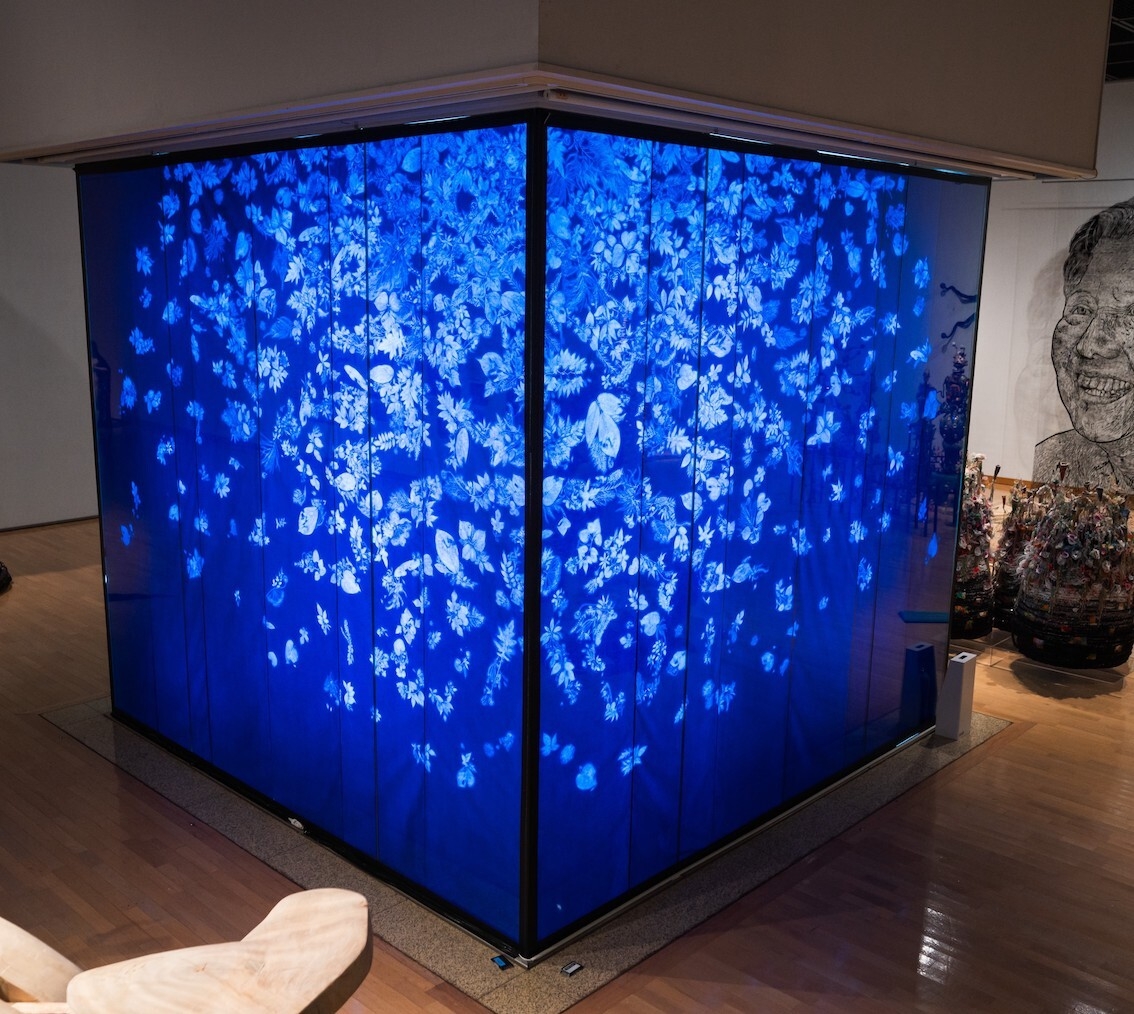 まず、カーボン紙のブルーの色に目を奪われる。一見遠くから見るとデザイン的なイメージかと思い、近づいてみるとその儚さと繊細さに衝撃を受ける。裏からの強いLEDライトもカタチを崩した植物のラインを強調している。ベースフォルムを福島第一原子力発電所建屋から成っている点、収集された植物が帰宅困難地域で被爆しただろう植物という点に心を打たれた。(和多利浩一)