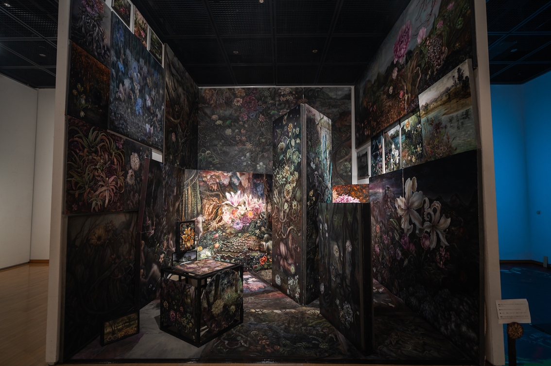 ユリ、ヒマワリ、アロエなどなど、巨大化した植物が画面を埋め尽くす。作者は、「森を歩くとき、感覚は研ぎ澄まされる。そこに息づくものの中に見えるものは、自身の絶望、葛藤、もがき、焦燥、畏怖、そして圧倒的な生命力。」だと言う。暗褐色の画面は、たしかに絶望や葛藤を暗示する。だが、パワフルな花々からは「圧倒的な生命力」を感じさせる。屋久島への旅をきっかけに日本各地を訪ね歩いた作者は、集大成として「絵画の森」をつくりあげたのである。(山下裕二)