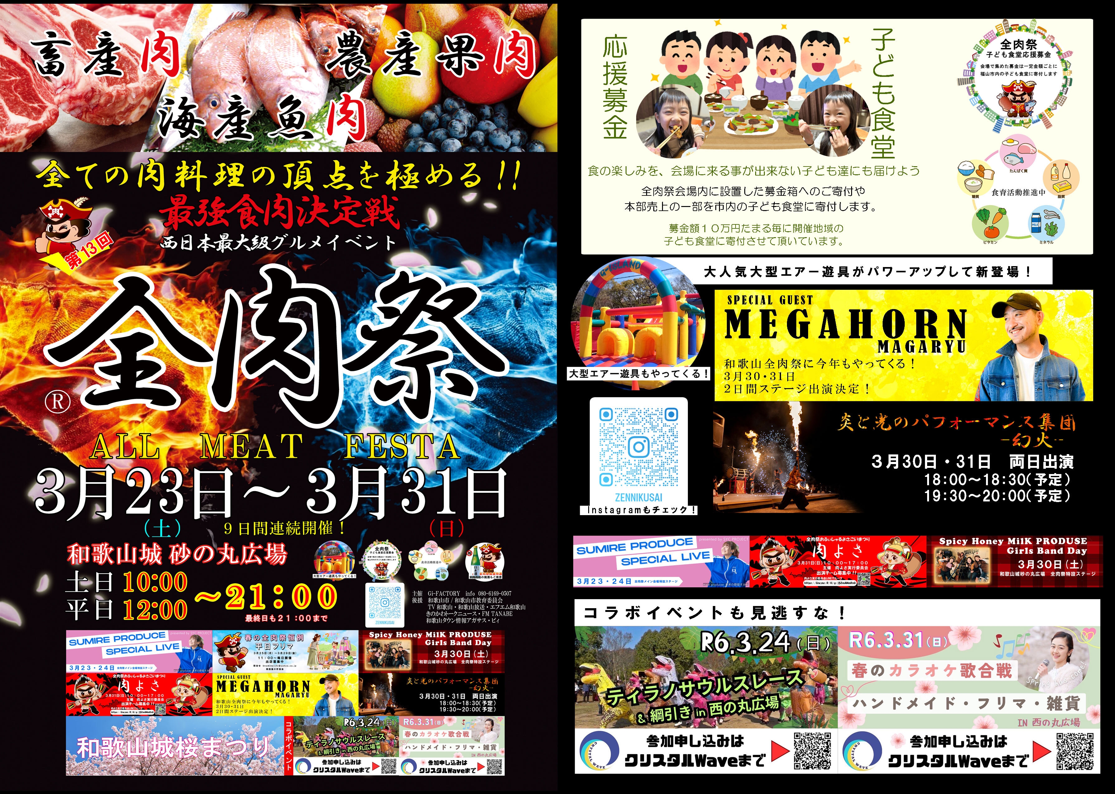 Gi-FACTORYは、和歌山・徳島・大阪・広島・山口・島根・岡山で開催している西日本最大級の大型野外グルメイベント『全肉祭』を2024年3月23日~3月31日の9日間、和歌山県和歌山市にある和歌山城砂の丸広場にて第13回開催を行います。