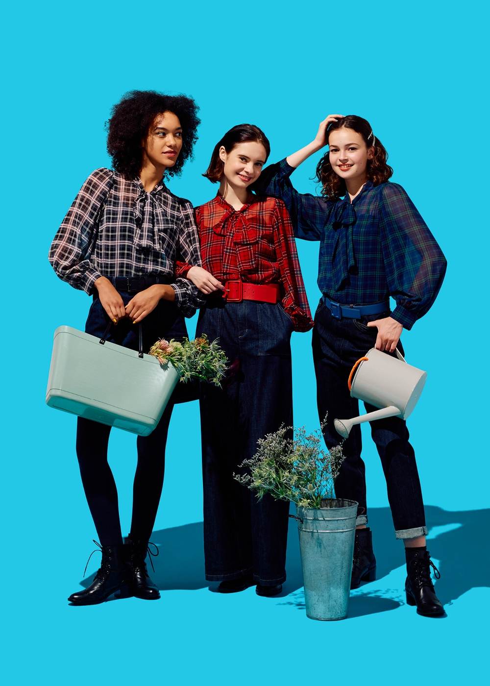 コレクションのメインとなる9月はビッグカラーのデザイン性あるトップスや、パリのヴィンテージショップに並ぶようなノスタルジックなプリントなど、トレンド感のあるアイテムが豊富にラインアップ。中でも今シーズンのトゥービー バイ アニエスベーを代表するのはヴィシーチェックのシリーズ。ジャケットとスカート、ひざ下丈のパンツで展開し、シーンに合わせて単体でもセットアップでも着こなしていただけます。