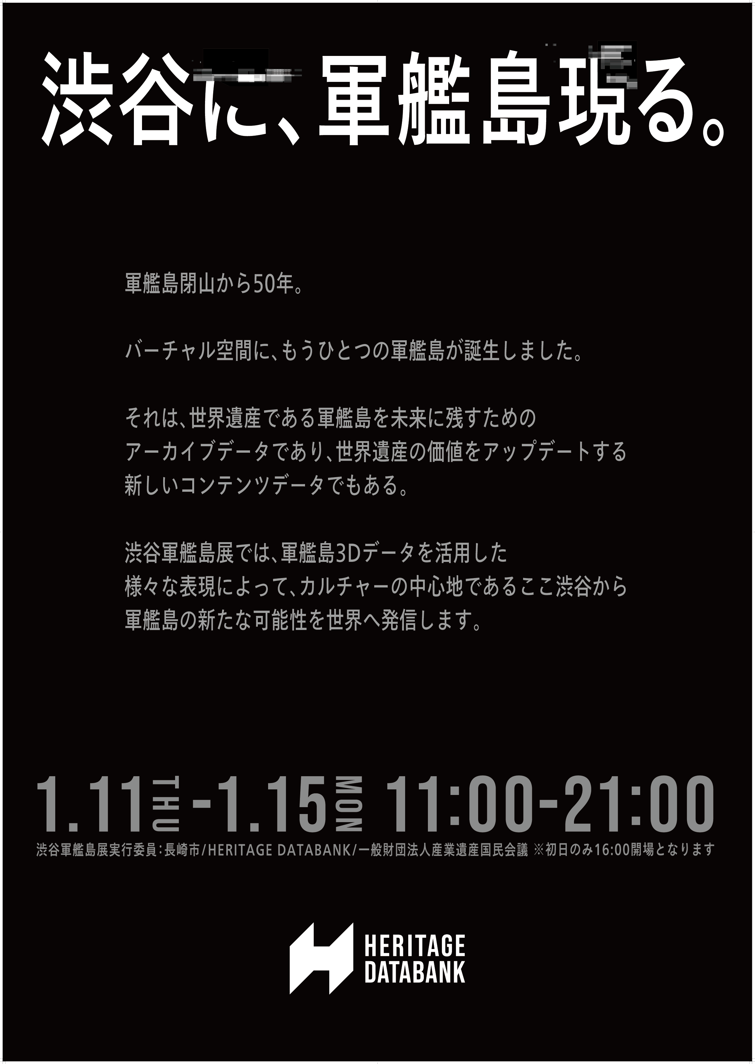 新しい世界遺産保全を目指す「HERITAGE DATABANK」プロジェクトと渋谷軍艦島展の概要を展示。