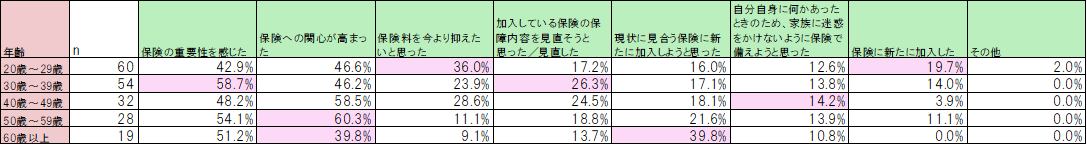 保険(死亡保険・医療保険)に対する考え方に変化があったと回答した人の理由を項目・年齢別にみると「保険料を今より抑えたいと思った」は20代の36.0%、「現状に見合った保険に新たに加入しようと思った」は60代の39.8%が最多となりました。